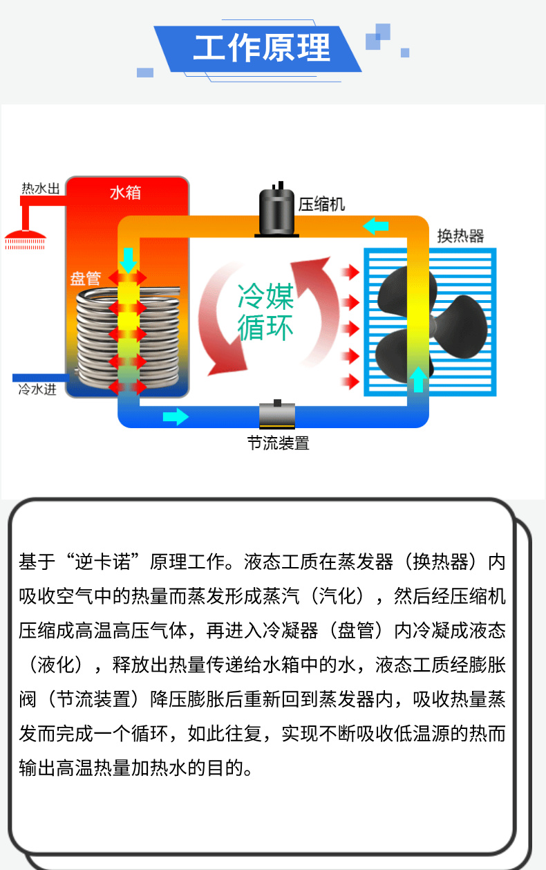 分體式空氣能熱水器主要依據(jù)“逆卡諾”原理工作,通過(guò)吸收空氣中的熱量并轉(zhuǎn)化為熱能來(lái)加熱水。室外機(jī)(風(fēng)機(jī)盤(pán)管)作為蒸發(fā)器,吸收外界空氣中的熱量,經(jīng)過(guò)壓縮機(jī)壓縮后,將高溫高壓的制冷劑輸送到室內(nèi)機(jī)(水箱內(nèi)的冷凝盤(pán)管),與水進(jìn)行熱交換,從而加熱水箱中的水。