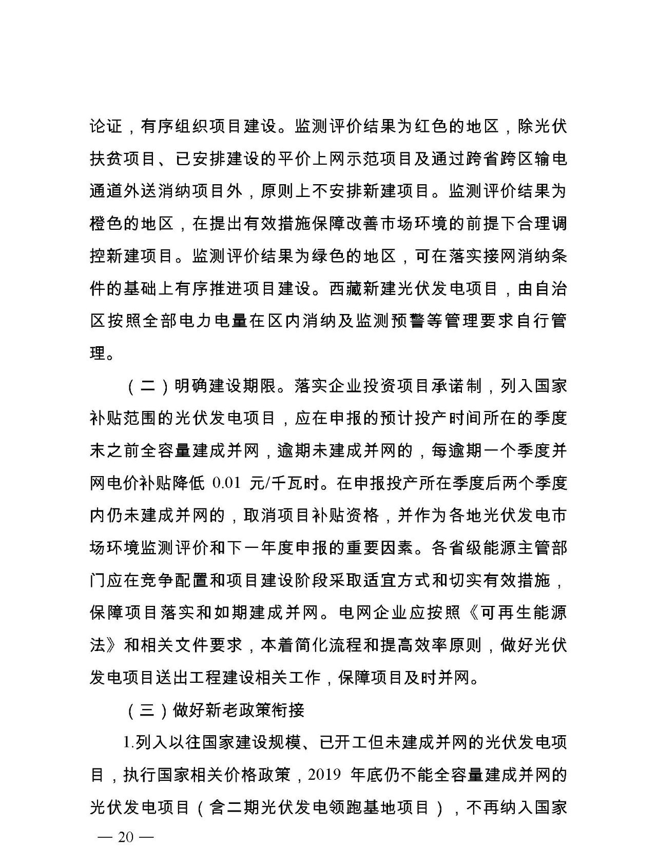 各省級能源主管部門會同各派出能源監(jiān)管機構(gòu)指導(dǎo)省級電網(wǎng)企業(yè)(包括省級政府管理的地方電網(wǎng)企業(yè),以下同),在充分考慮已并網(wǎng)項目和已核準(zhǔn)(備案)項目的消納需求基礎(chǔ)上,對所在省級區(qū)域風(fēng)電、光伏發(fā)電新增建設(shè)規(guī)模的消納條件進(jìn)行測算論證,做好新建風(fēng)電、光伏發(fā)電項目與電力送出工程建設(shè)的銜接并落實消納方案,優(yōu)先保障平價上網(wǎng)項目的電力送出和消納。