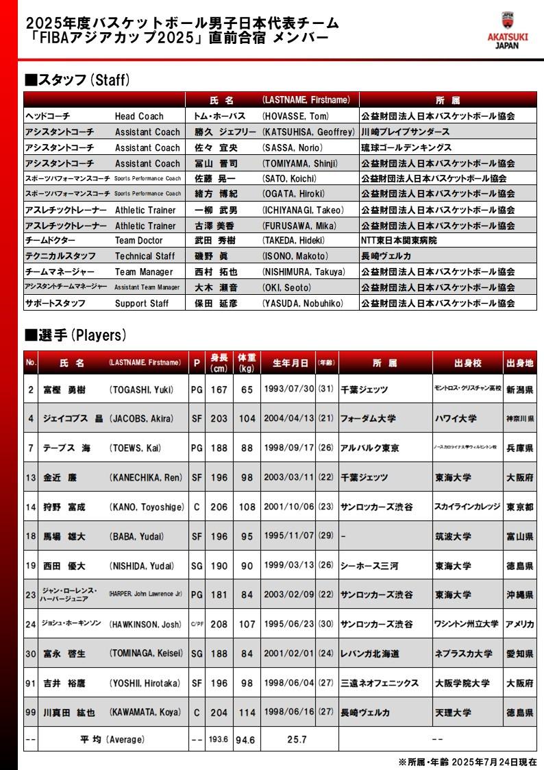 北京時間7月24日,日本男籃官方公布了2025男籃亞洲杯的12人集訓名單。