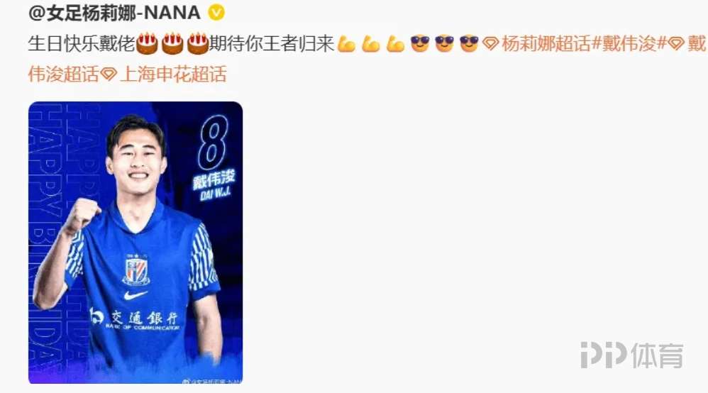 女足國腳楊莉娜更新了個(gè)人社媒,向申花球員戴偉浚送上生日祝福。