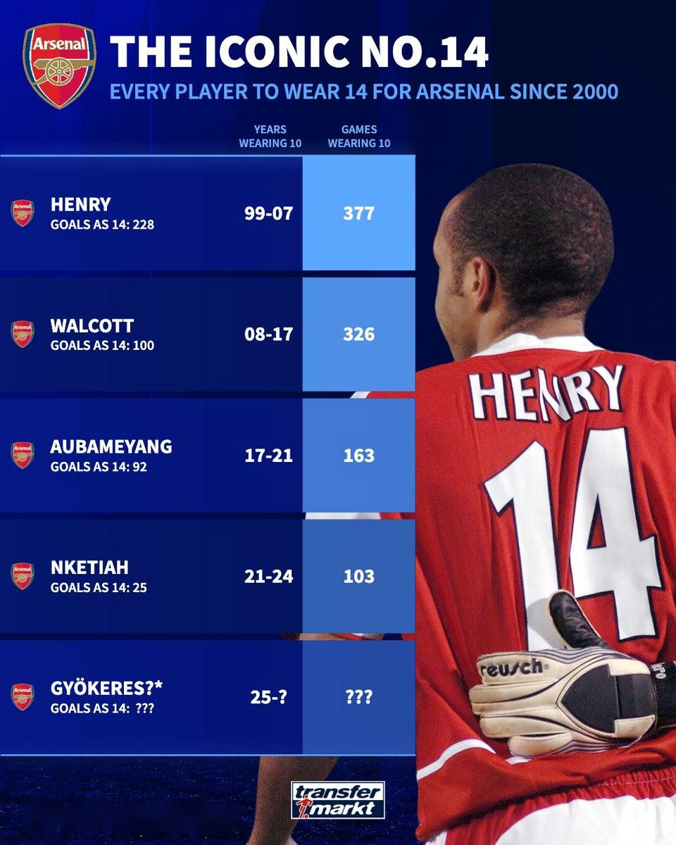 據(jù)悉哲凱賴什將在阿森納身披14號(hào)球衣,這個(gè)號(hào)碼因俱樂部歷史最佳射手亨利而變得傳奇,《德國轉(zhuǎn)會(huì)市場》也列出了新世紀(jì)身披過阿森納14號(hào)的球員。