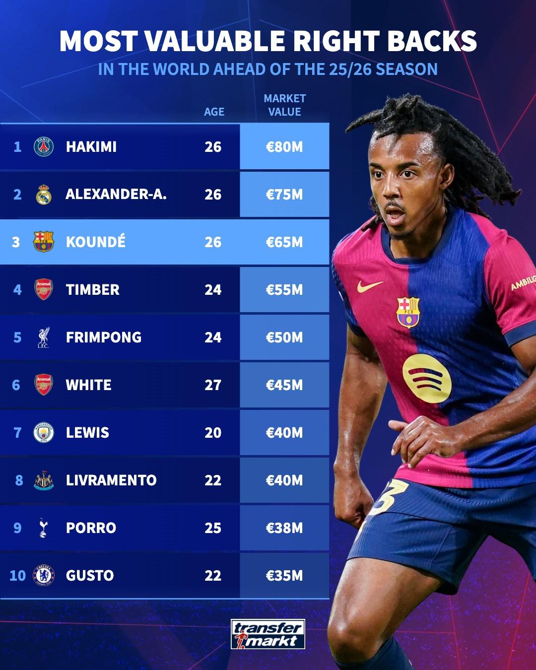 德轉(zhuǎn)列全球身價(jià)最高右后衛(wèi):阿什拉夫榜首,阿諾德、孔德在列
